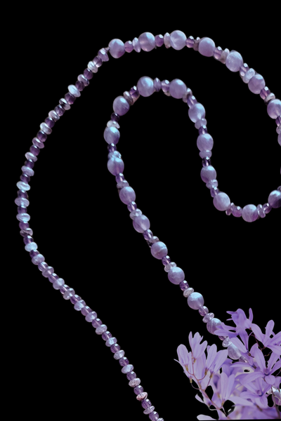 Asymetrical amethyst bead necklace with smaller beads on one side and larger beads on the other side with Amethyst Silver Finish Wire-Wrapped Tree of Life Teardrop Pendant 30x50mm. Matching bracelet with a silver finish leaf clasp.