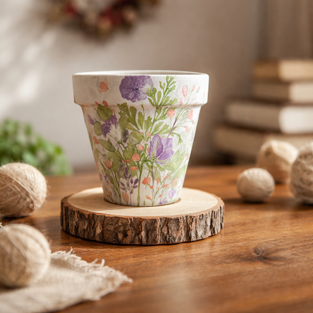 6″ clay pots decoupaged with purple and green floral napkin to give a special touch to your green plants. Accept custom design inquiries.