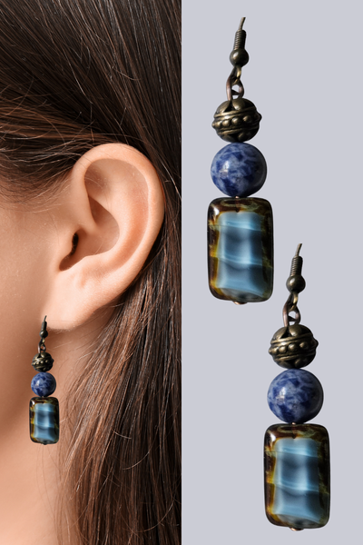 Warm blues and brown colors. Ceramic rectangular beads, blue marbled gemstone, and brass filigree bead with brass hooks.