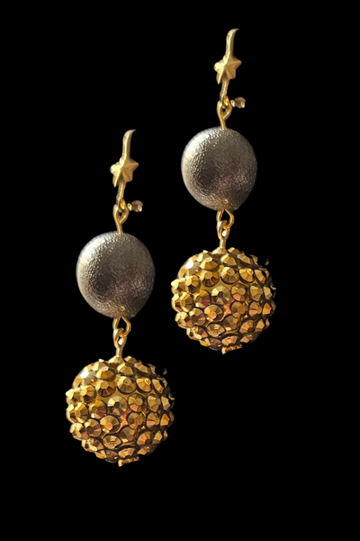 Get your New Year’s Eve outfit ready with these bubble gum beads that look just like the New Years Eve ball. This pair has a gold base made with acrylic and gunmetal-finished “pewter” for a glitzy look. Shiny, textured black beads compliment the gold which highlight the look of these earrings.