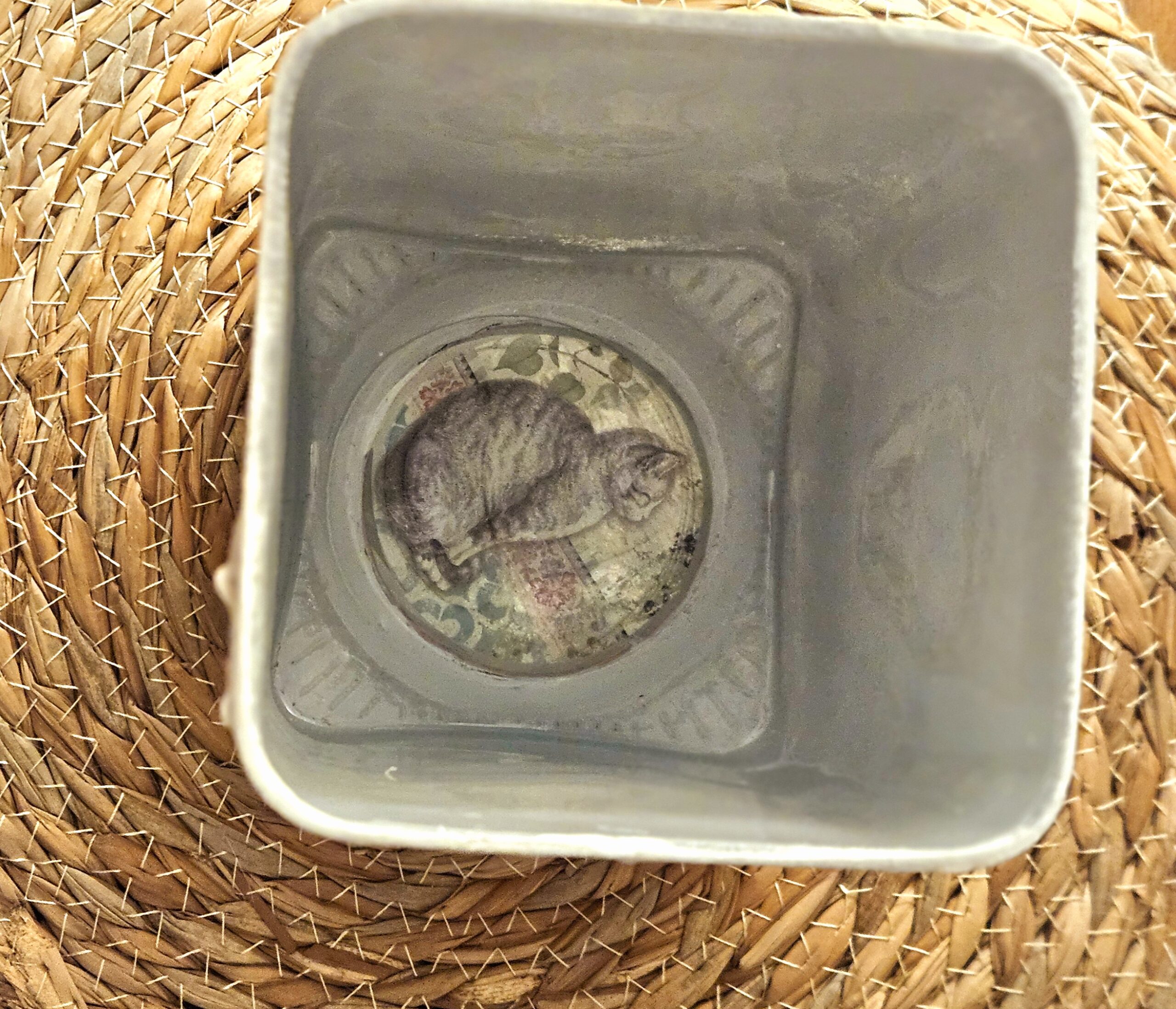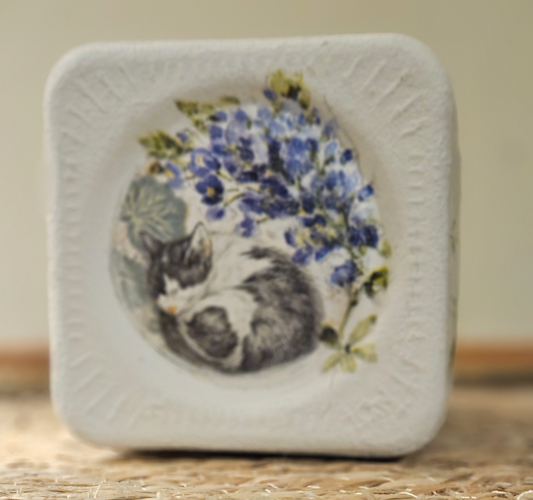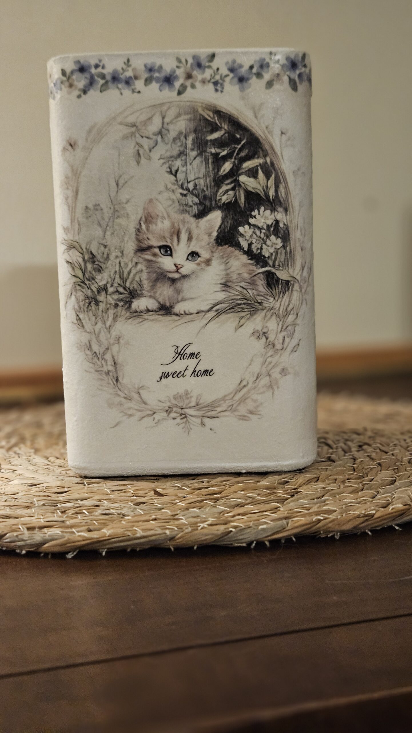 This vase, textured with mulberry paper, highlights cats on the outside and inside and on the bottom.